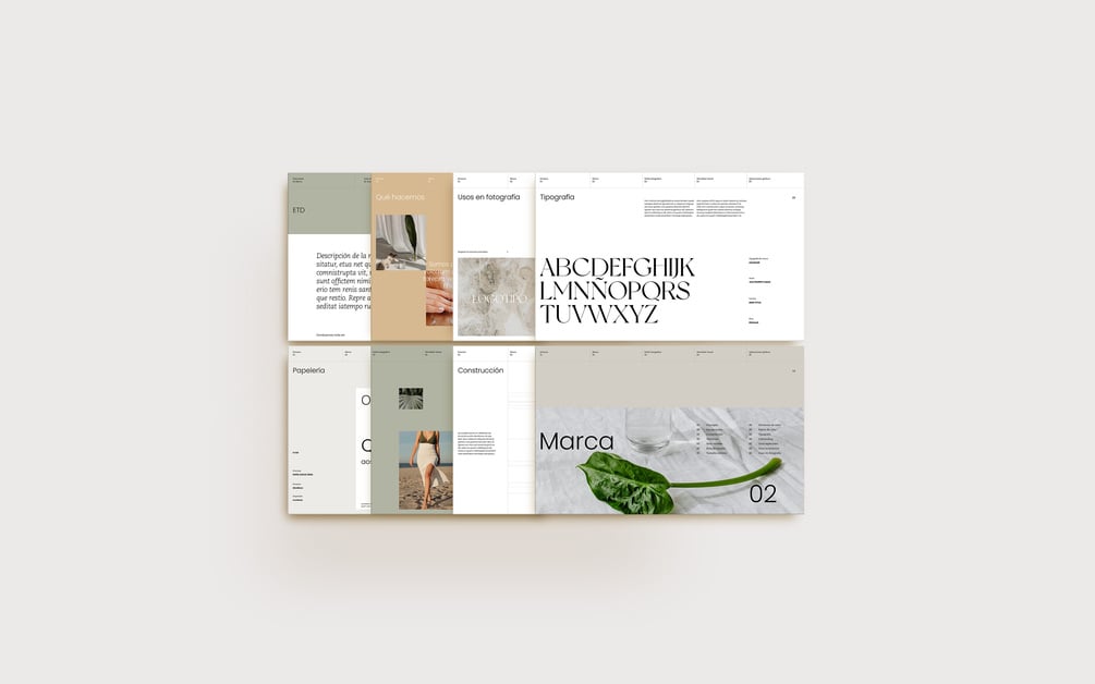 - 5 páginas de separadores: entorno de marca, construcción de marca, identidad visual, estilo fotográfico y aplicaciones gráficas